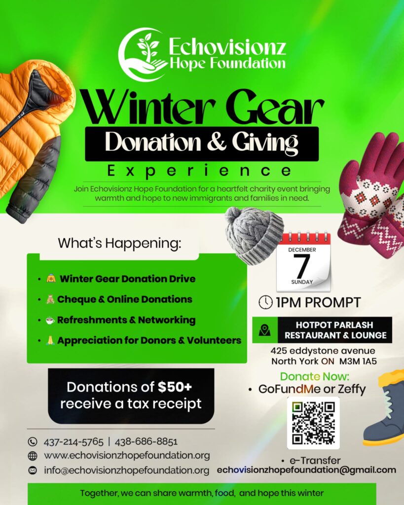 Join Echovisionz Hope Foundation for a heartfelt charity event bringing warmth and hope to new immigrants and families in need.